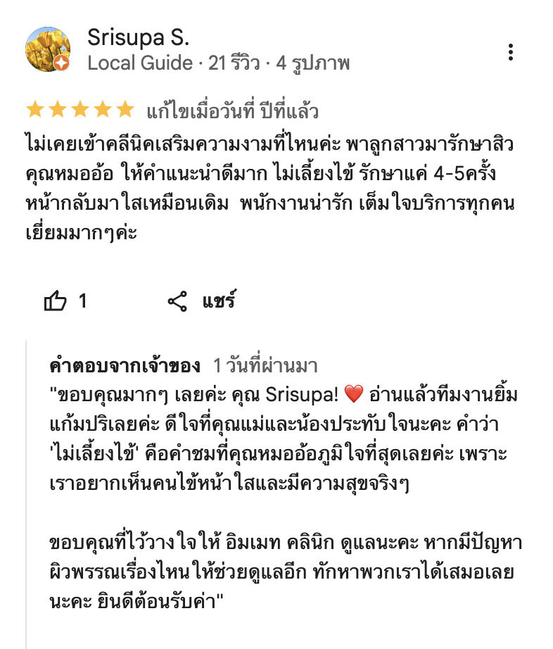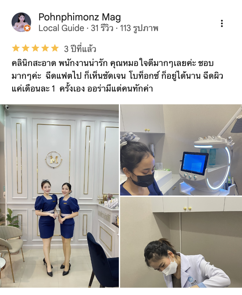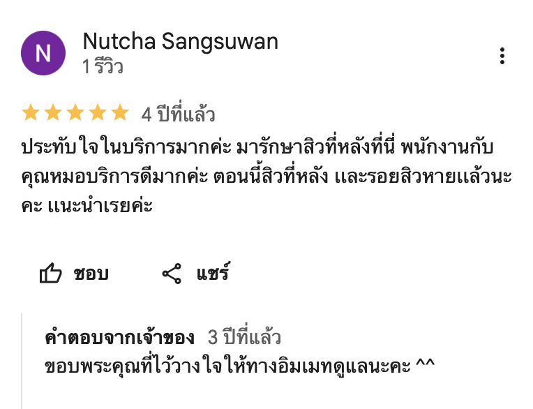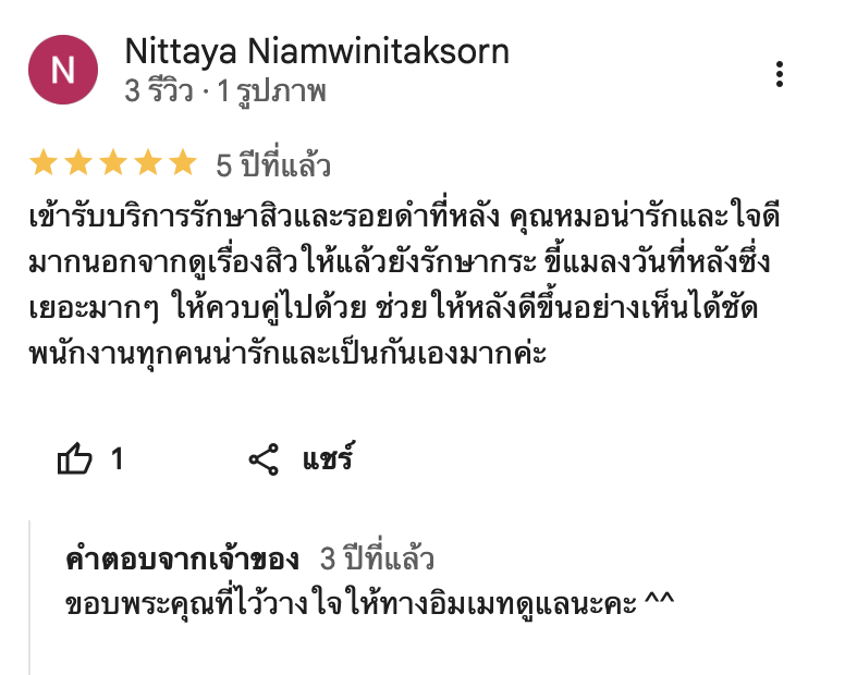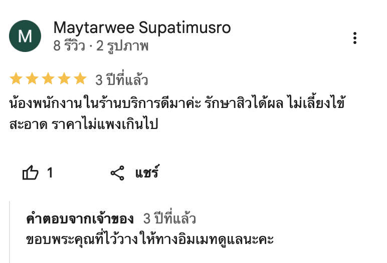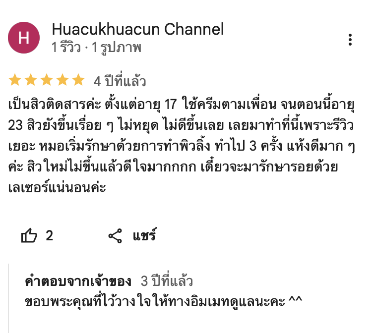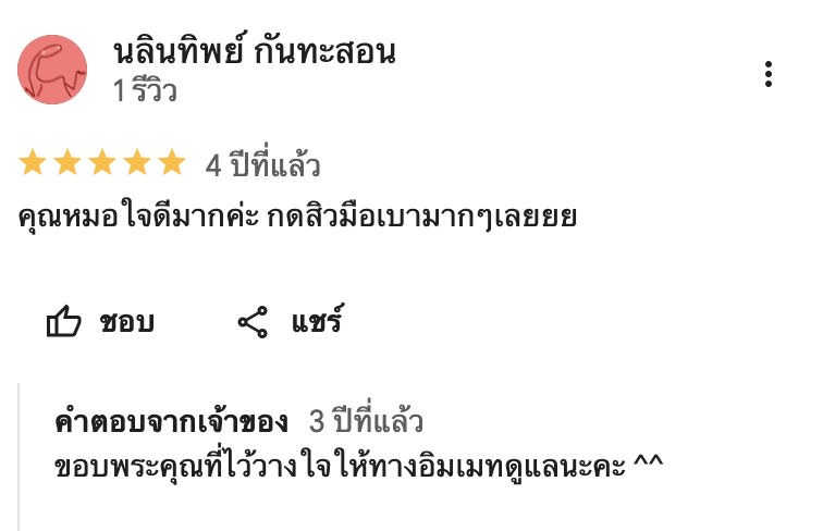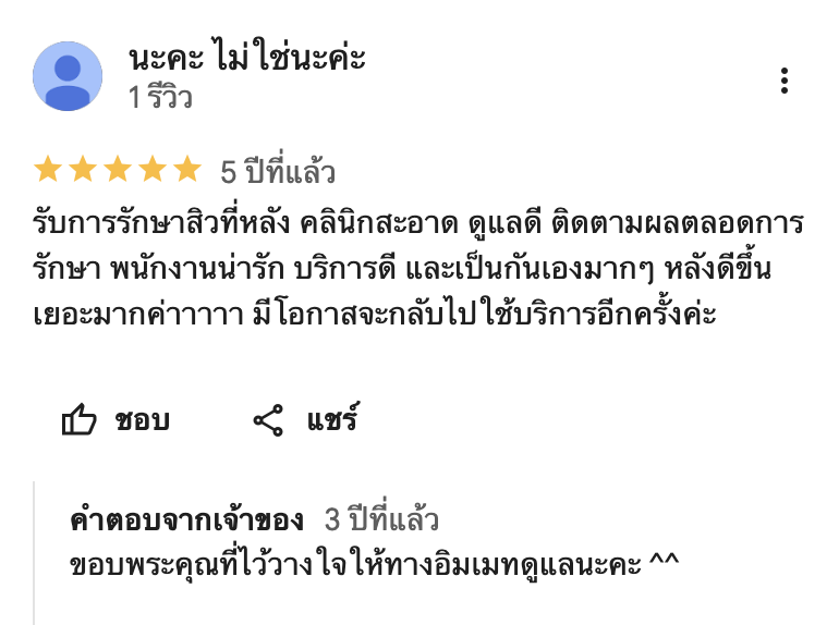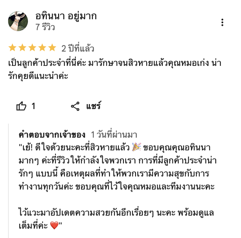 โพสต์บน ปพิชญา าา Trustindex ตรวจสอบว่าแหล่งที่มาดั้งเดิมของรีวิวคือ Google ดีมากค่ะ ทำแล้วหน้าเบามากค่ะ โพสต์บน A Google User Trustindex ตรวจสอบว่าแหล่งที่มาดั้งเดิมของรีวิวคือ Google ดีมากค่ะ บริการดี คุณหมอน่ารักเป็นกันเอง โพสต์บน Jularat Khokkunthod Trustindex ตรวจสอบว่าแหล่งที่มาดั้งเดิมของรีวิวคือ Google บริการดีมากเลยคะคลินิคสะอาดคุณหมอให้คำปรึกษาดีพูดเพราะน้องๆพนักงานนิสัยน่ารักมากๆ โพสต์บน ศิวพลอย สกุลรัตน์ชวัล Trustindex ตรวจสอบว่าแหล่งที่มาดั้งเดิมของรีวิวคือ Google มาให้อิมเมทดูแล 1 ปีเต็มทางคลินิกไม่เคยขอให้รีวิว แต่อยากแนะนำมากๆ เราอายู ใกล้เลข 5 มาด้วยปัญหาสิวและฝ้าเต็มหน้ารู้สึกไม่มั่นใจมากๆ มารักษากับคุณหมออ้อส่วนตัวรักษาสิวประมาณ 2-3 ครั้งสิวหาย ฝ้าก็จางลงเรื่อยๆ บอกเลยว่าที่นี่ตั้งแต่รักษามา ไม่เคยยัดเยียดคอร์สมาทีไรสบายใจทุกครั้ง มีปัญหากังวลตรงไหนปรึกษาคุณหมอได้เลย หัตถการคุณหมองานละเอียดมากดูแลดีจริงๆค่ะ พนักงานทุกน่ารักพูดจาไพเราะ ราคาก็ยุติธรรม มั่นใจให้คุณหมออ้อดูแลตลอดไปเลยค่ะ ขอบคุณทางคลินิกนะคะดูแลกันจนตอนนี้รู้สึกดีขึ้นมากๆ มั่นใจในตัวเองขึ้นเยอะเลยค่า👍❤️ โพสต์บน Sm 1998 Trustindex ตรวจสอบว่าแหล่งที่มาดั้งเดิมของรีวิวคือ Google แนะนำค่ะไม่ขายคอร์สเลย บริหารดี โพสต์บน Srisupa S. Trustindex ตรวจสอบว่าแหล่งที่มาดั้งเดิมของรีวิวคือ Google ไม่เคยเข้าคลีนิคเสริมความงามที่ไหนค่ะ พาลูกสาวมารักษาสิว คุณหมออ้อ ให้คำแนะนำดีมาก ไม่เลี้ยงไข้ รักษาแค่ 4-5ครั้งหน้ากลับมาใสเหมือนเดิม พนักงานน่ารัก เต็มใจบริการทุกคน เยี่ยมมากๆค่ะ โพสต์บน Peeraya Seepong Trustindex ตรวจสอบว่าแหล่งที่มาดั้งเดิมของรีวิวคือ Google บังเอิญเจอคลีนิคนี้เห็นว่าใกล้บ้านเลยลองมาดู อยากจะบอกว่าดีมากๆๆค่ะ ร้านสะอาดและสวย พนักงานน่ารัก ไม่ขายคอร์สเลย รู้สึกสบายใจจนอยากจะซื้อคอร์สเอง คุณหมออ้อก็น่ารักเข้ามาฉีดสิวให้ ราคาไม่แพงด้วย ประทับใจ ไม่ต้องไปไหนไกลละ ทำยาวๆๆๆ ปล.ไม่ใช่หน้าม้านะคะ รีวิวเองเพราะประทับใจจริงๆ โพสต์บน อทินนา อยู่มาก Trustindex ตรวจสอบว่าแหล่งที่มาดั้งเดิมของรีวิวคือ Google เป็นลูกค้าประจำที่นี่ค่ะ มารักษาจนสิวหายแล้วคุณหมอเก่ง น่ารักคุยดีแนะนำค่ะ โพสต์บน karnchanok santisarn Trustindex ตรวจสอบว่าแหล่งที่มาดั้งเดิมของรีวิวคือ Google เราซื้อคอร์สรักษาสิวทั้งหมด 8 ครั้ง ราคารวมกับยา กะประมาณสองหมื่นกลางๆ ตอนที่ปรึกษากับคุณหมอ บอกว่า 8 ครั้งน่าจะหน้าใสแน่นอน แต่หลังจากทำไปแปดครั้ง สิวก็ขึ้นน้อยลงจากเดิม แต่รอยแดงยังเหลืออยู่เยอะพอสมควร ซึ่งในแต่ละคนก็อาจจะหายไม่เหมือนกัน แล้วแต่คนค่ะ โหลดเพิ่ม