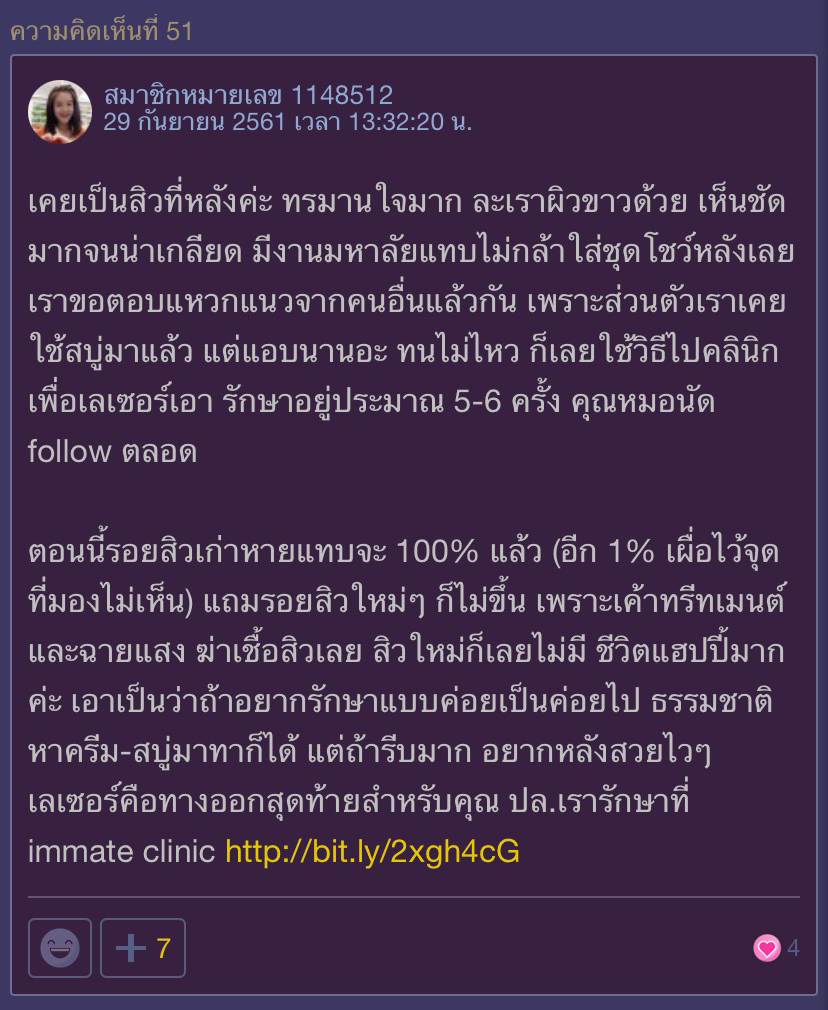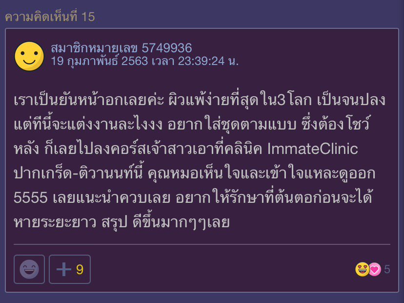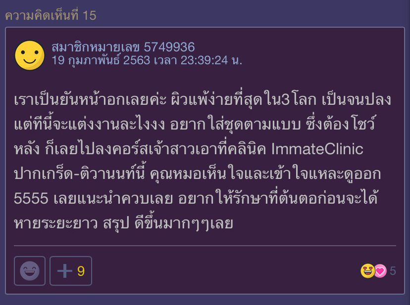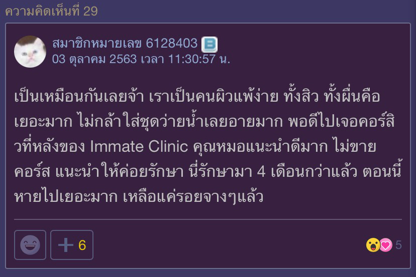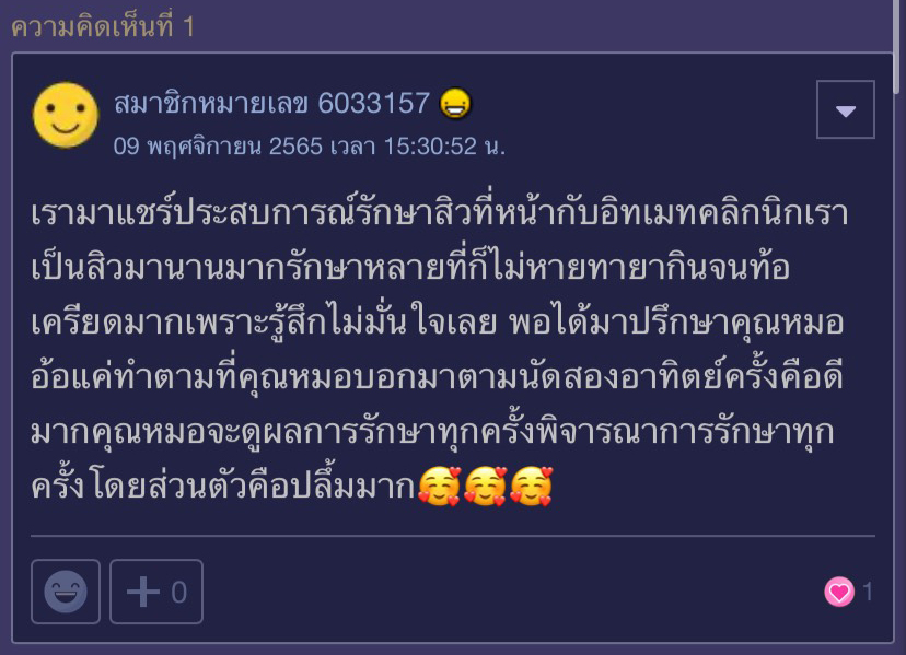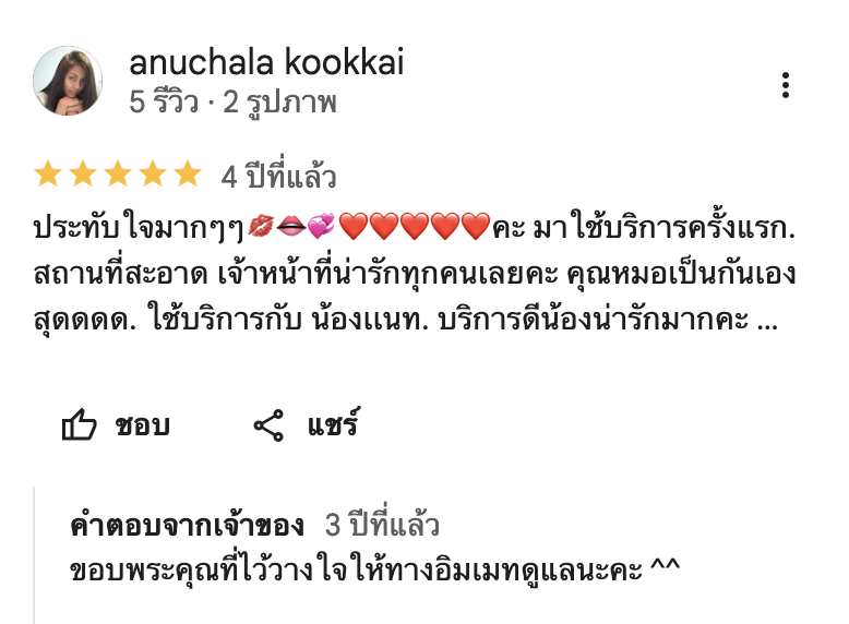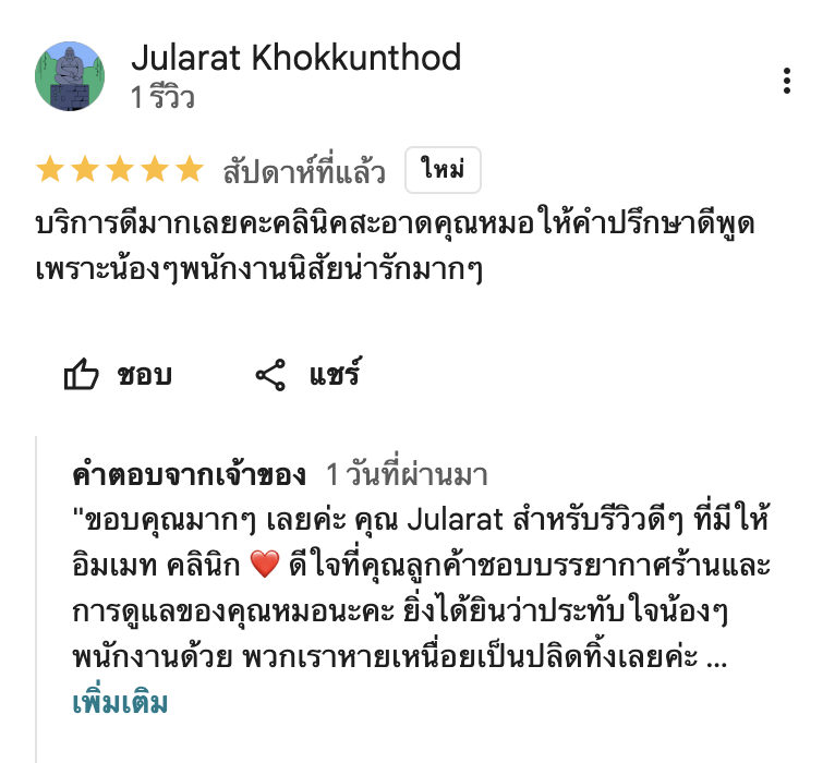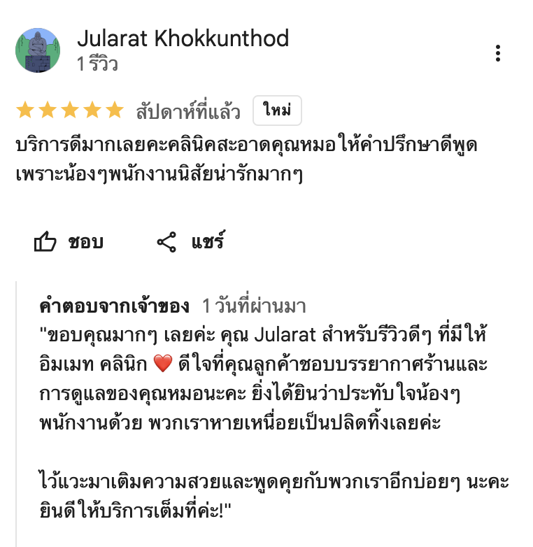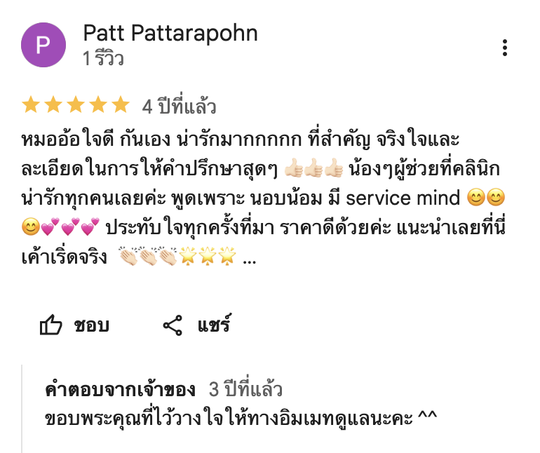 โพสต์บน ปพิชญา าา Trustindex ตรวจสอบว่าแหล่งที่มาดั้งเดิมของรีวิวคือ Google ดีมากค่ะ ทำแล้วหน้าเบามากค่ะ โพสต์บน A Google User Trustindex ตรวจสอบว่าแหล่งที่มาดั้งเดิมของรีวิวคือ Google ดีมากค่ะ บริการดี คุณหมอน่ารักเป็นกันเอง โพสต์บน Jularat Khokkunthod Trustindex ตรวจสอบว่าแหล่งที่มาดั้งเดิมของรีวิวคือ Google บริการดีมากเลยคะคลินิคสะอาดคุณหมอให้คำปรึกษาดีพูดเพราะน้องๆพนักงานนิสัยน่ารักมากๆ โพสต์บน ศิวพลอย สกุลรัตน์ชวัล Trustindex ตรวจสอบว่าแหล่งที่มาดั้งเดิมของรีวิวคือ Google มาให้อิมเมทดูแล 1 ปีเต็มทางคลินิกไม่เคยขอให้รีวิว แต่อยากแนะนำมากๆ เราอายู ใกล้เลข 5 มาด้วยปัญหาสิวและฝ้าเต็มหน้ารู้สึกไม่มั่นใจมากๆ มารักษากับคุณหมออ้อส่วนตัวรักษาสิวประมาณ 2-3 ครั้งสิวหาย ฝ้าก็จางลงเรื่อยๆ บอกเลยว่าที่นี่ตั้งแต่รักษามา ไม่เคยยัดเยียดคอร์สมาทีไรสบายใจทุกครั้ง มีปัญหากังวลตรงไหนปรึกษาคุณหมอได้เลย หัตถการคุณหมองานละเอียดมากดูแลดีจริงๆค่ะ พนักงานทุกน่ารักพูดจาไพเราะ ราคาก็ยุติธรรม มั่นใจให้คุณหมออ้อดูแลตลอดไปเลยค่ะ ขอบคุณทางคลินิกนะคะดูแลกันจนตอนนี้รู้สึกดีขึ้นมากๆ มั่นใจในตัวเองขึ้นเยอะเลยค่า👍❤️ โพสต์บน Sm 1998 Trustindex ตรวจสอบว่าแหล่งที่มาดั้งเดิมของรีวิวคือ Google แนะนำค่ะไม่ขายคอร์สเลย บริหารดี โพสต์บน Srisupa S. Trustindex ตรวจสอบว่าแหล่งที่มาดั้งเดิมของรีวิวคือ Google ไม่เคยเข้าคลีนิคเสริมความงามที่ไหนค่ะ พาลูกสาวมารักษาสิว คุณหมออ้อ ให้คำแนะนำดีมาก ไม่เลี้ยงไข้ รักษาแค่ 4-5ครั้งหน้ากลับมาใสเหมือนเดิม พนักงานน่ารัก เต็มใจบริการทุกคน เยี่ยมมากๆค่ะ โพสต์บน Peeraya Seepong Trustindex ตรวจสอบว่าแหล่งที่มาดั้งเดิมของรีวิวคือ Google บังเอิญเจอคลีนิคนี้เห็นว่าใกล้บ้านเลยลองมาดู อยากจะบอกว่าดีมากๆๆค่ะ ร้านสะอาดและสวย พนักงานน่ารัก ไม่ขายคอร์สเลย รู้สึกสบายใจจนอยากจะซื้อคอร์สเอง คุณหมออ้อก็น่ารักเข้ามาฉีดสิวให้ ราคาไม่แพงด้วย ประทับใจ ไม่ต้องไปไหนไกลละ ทำยาวๆๆๆ ปล.ไม่ใช่หน้าม้านะคะ รีวิวเองเพราะประทับใจจริงๆ โพสต์บน อทินนา อยู่มาก Trustindex ตรวจสอบว่าแหล่งที่มาดั้งเดิมของรีวิวคือ Google เป็นลูกค้าประจำที่นี่ค่ะ มารักษาจนสิวหายแล้วคุณหมอเก่ง น่ารักคุยดีแนะนำค่ะ โพสต์บน karnchanok santisarn Trustindex ตรวจสอบว่าแหล่งที่มาดั้งเดิมของรีวิวคือ Google เราซื้อคอร์สรักษาสิวทั้งหมด 8 ครั้ง ราคารวมกับยา กะประมาณสองหมื่นกลางๆ ตอนที่ปรึกษากับคุณหมอ บอกว่า 8 ครั้งน่าจะหน้าใสแน่นอน แต่หลังจากทำไปแปดครั้ง สิวก็ขึ้นน้อยลงจากเดิม แต่รอยแดงยังเหลืออยู่เยอะพอสมควร ซึ่งในแต่ละคนก็อาจจะหายไม่เหมือนกัน แล้วแต่คนค่ะ โหลดเพิ่ม